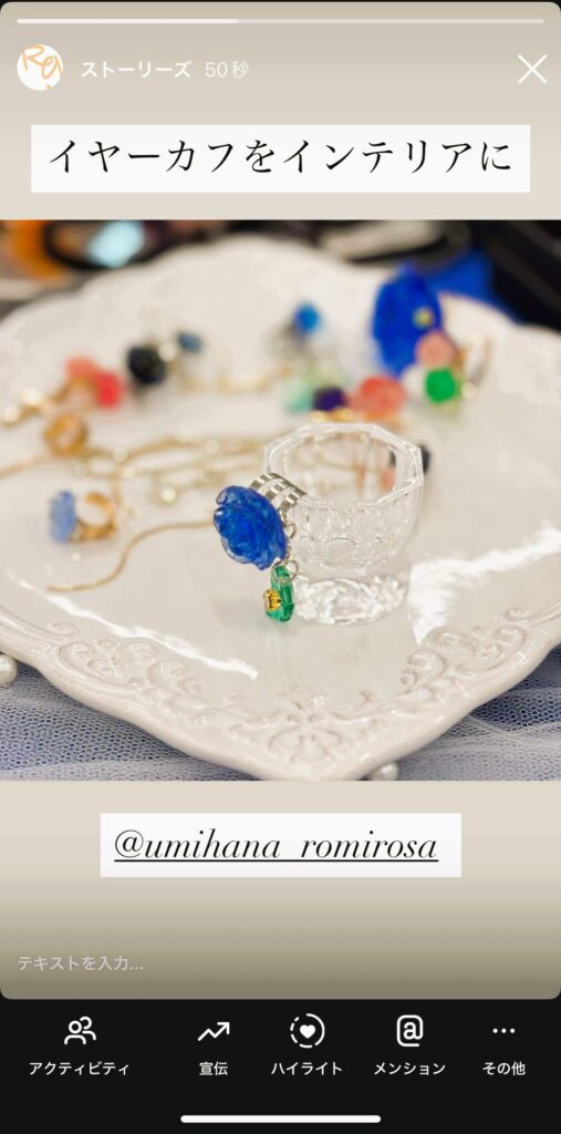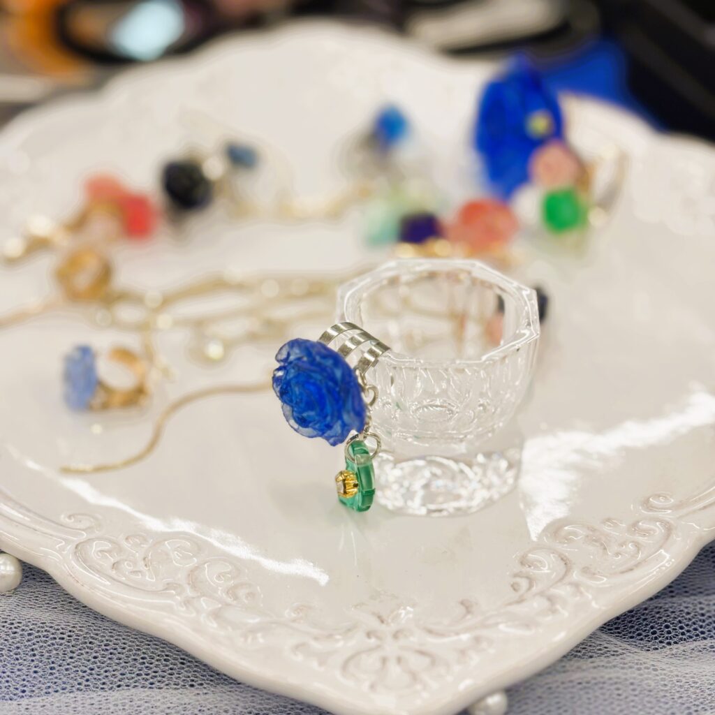 お隣の 「うみはな🌹アクセサリー🌹ショップ ROMIROSA」 さんと交流する中で、ダッペングラスにイヤーカフを飾るという新しい使い方を発見しました。