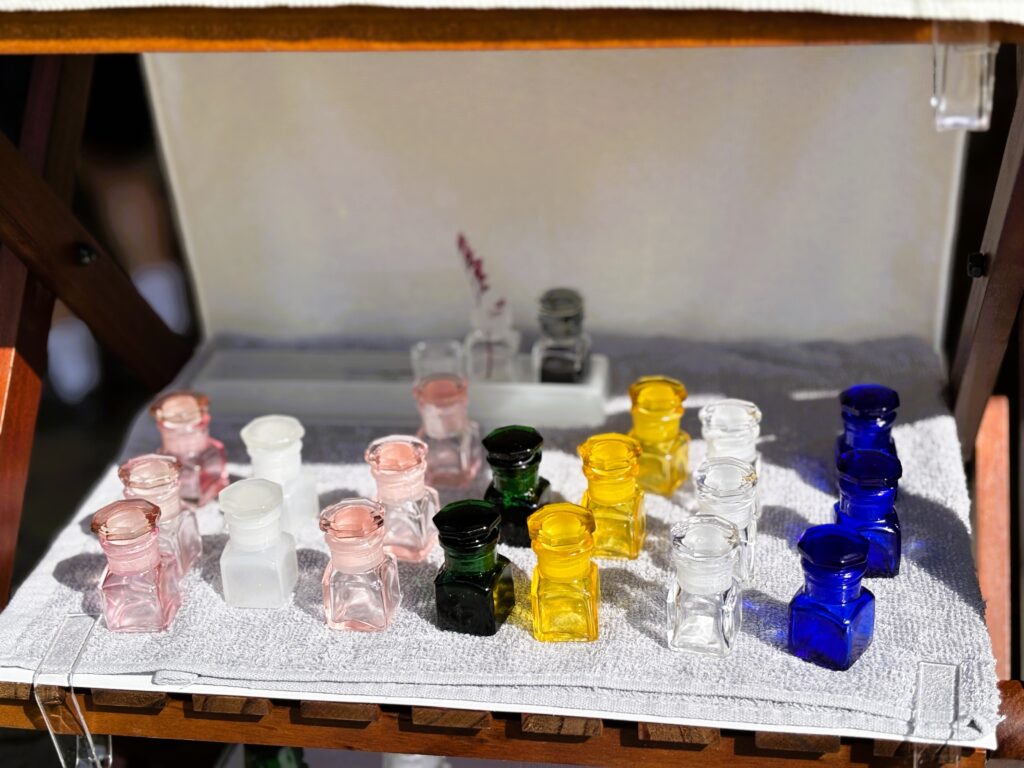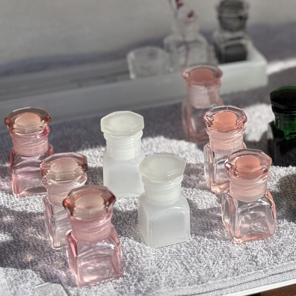 お話の流れで、ピンク薬瓶の間にあったホワイト薬瓶と、有帽瓶の小サイズ(透明)も一緒にお求めいただきました。