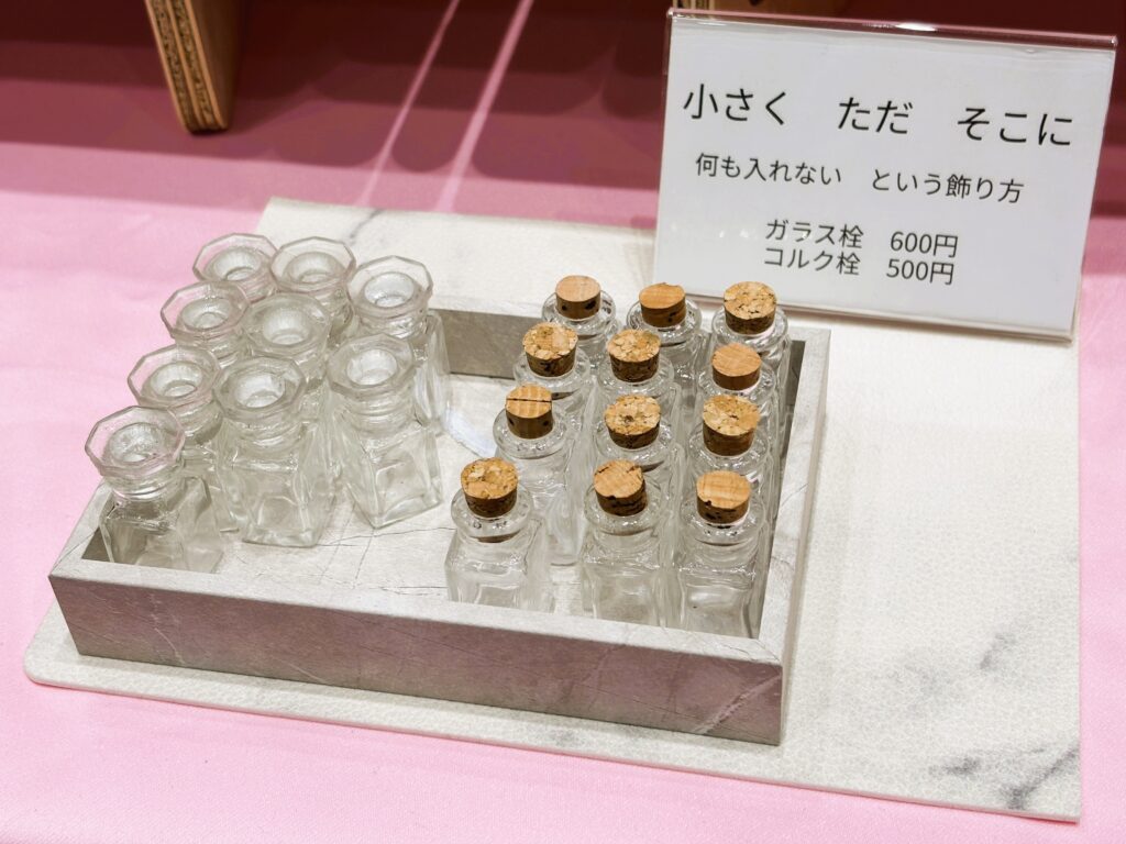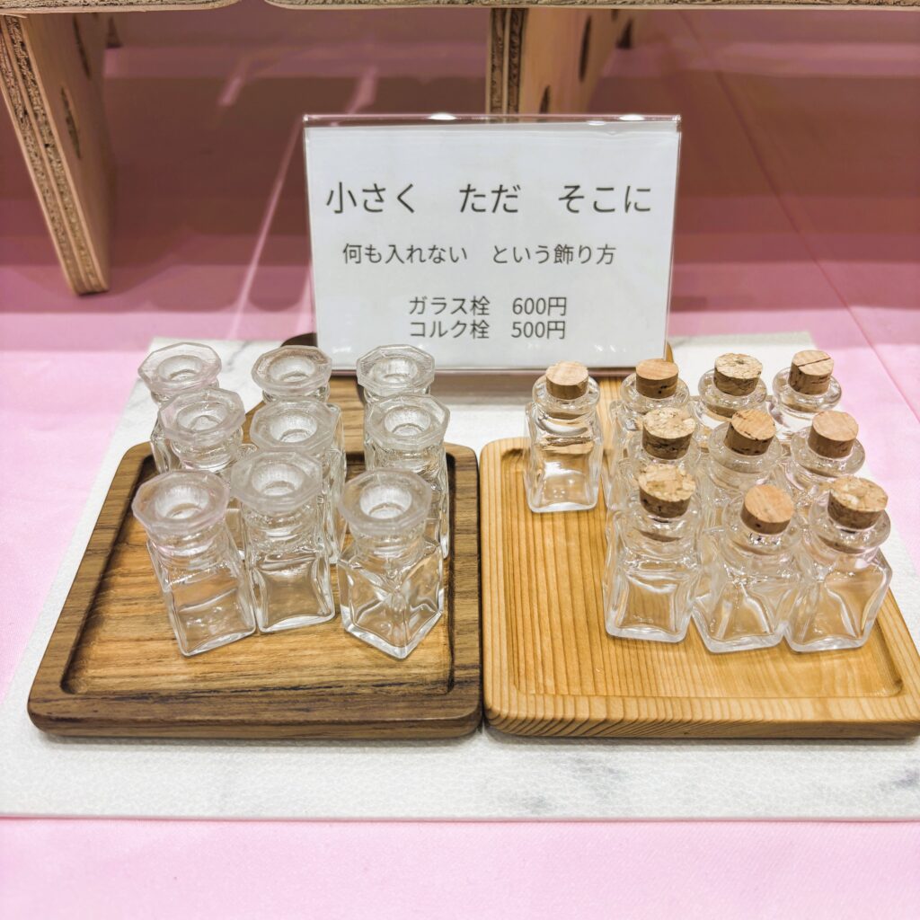 お向かいのブースの木工細工さんでとてもいいトレーを発見したのでそちらを2つ購入し、ガラス栓とコルク栓をそれぞれのトレーに。