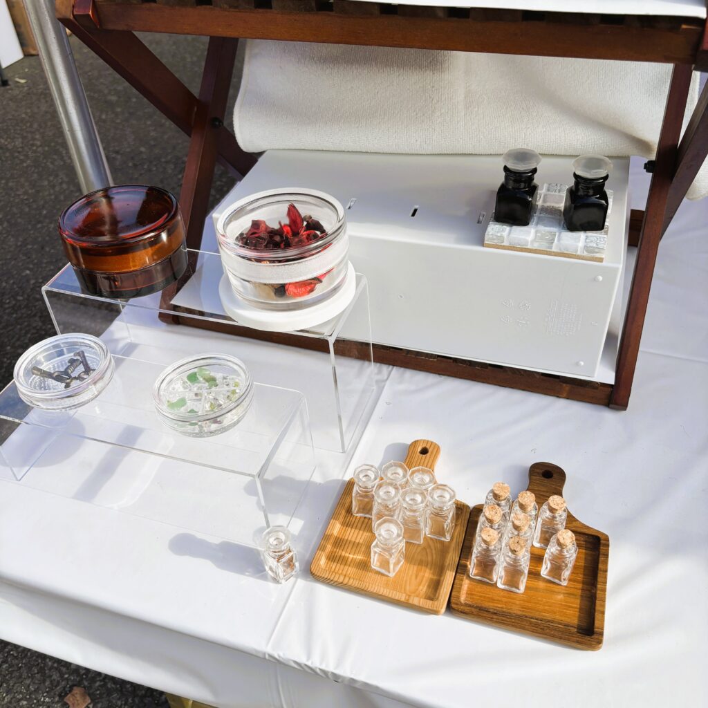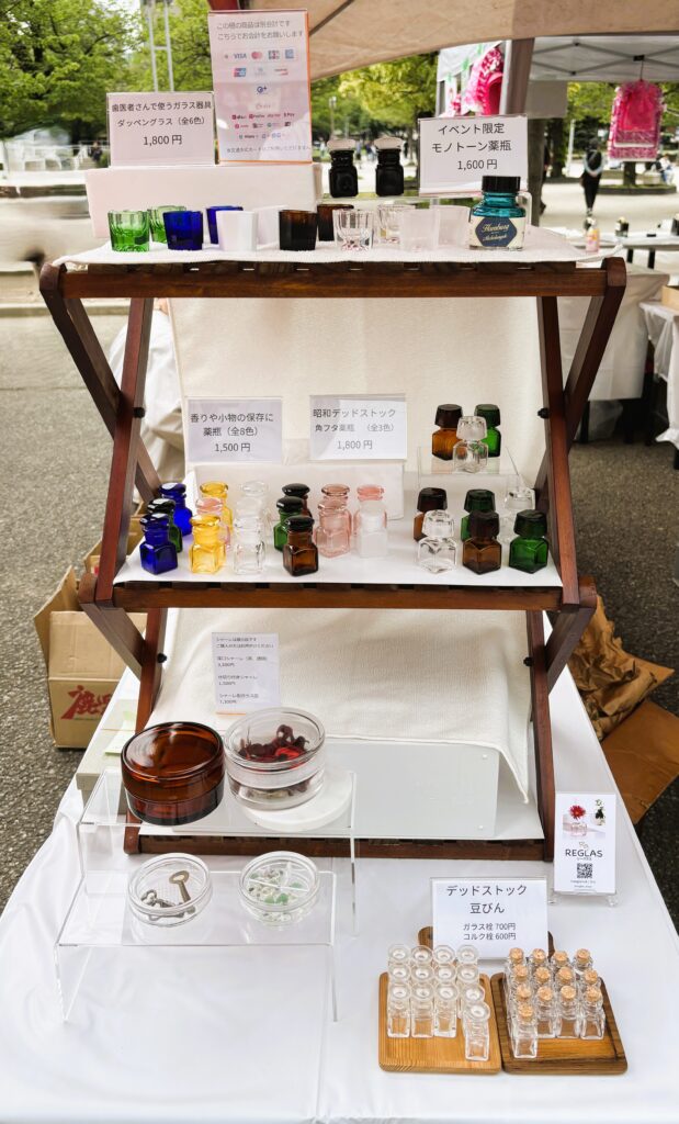 そんな賑わいの中、REGLASにもお客様が立ち寄ってくださいました。さっそくSNS(X)でフォローいただいている方が、今回初出品のイベント限定品、モノトーン薬瓶をご購入くださいました。Xで紹介されているのを見て気になっていたとのこと。こうして実際にお会いして会話できるのは、イベントならではの楽しさだと感じます。